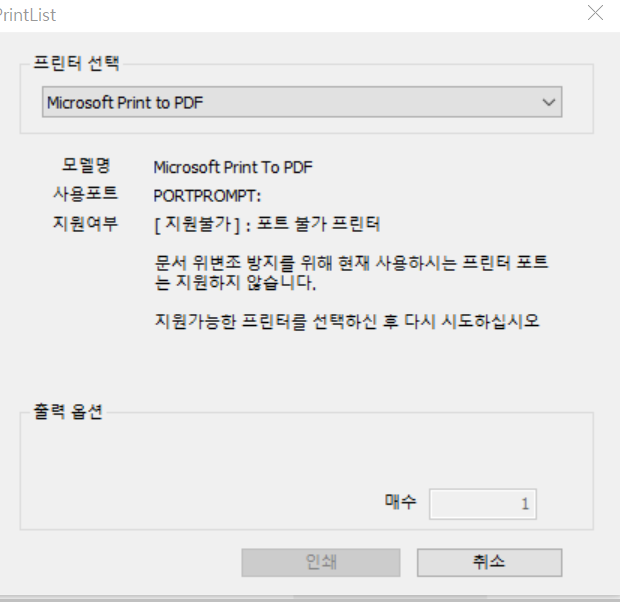 - 출력화면에서 위의 사진과 같이 Microsoft Print to PDF 를 클릭하여 인쇄하기를 진행합니다.