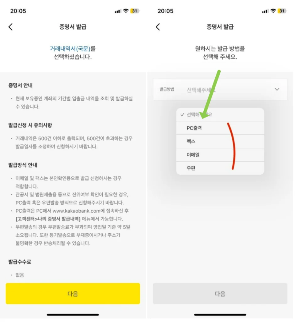 - 위와 같은 자료를 사진과 같이 출력(PC출력, 팩스, 이메일, 우편)하고자 하는 선택을 하여 클릭합니다.