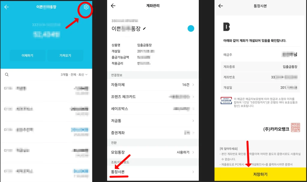 카카오뱅크 통장사본 저장 하는 위치를 찾는 분들이 많으십니다. 비대면으로 통장을 개설을 하였지만, 어느 부분을 클릭해서 저장을 해야하는지 안내드리겠습니다.